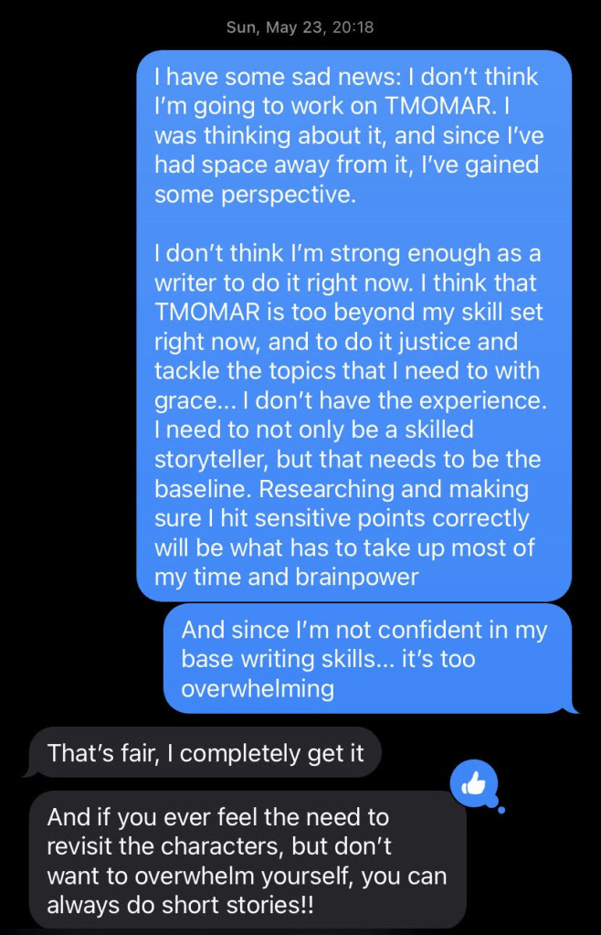 This is where I started thinking that I needed to write a trauma story. This is where everything went horribly wrong. From my (limited) knowledge of a sensitive topic, I assumed that I needed to hyperfocus on that sensitive topic in order to tell the story I wanted to tell. TMOMAR shifted from being an adventure story—something well within “my lane” to write—into a story I had (and still don’t have) the qualifications to write.